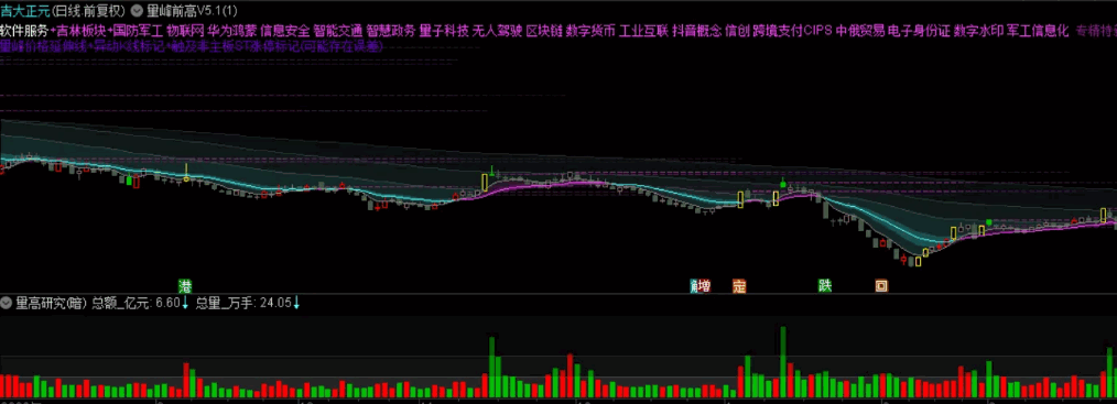↖2024年4月,吉大正元主图示意(量峰前高V5.1,参数LINES=1,显示均线)