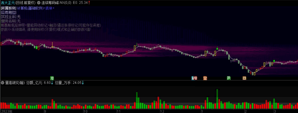 ↖2024年4月,吉大正元主图示意(连续筹码峰NX,参数LINES=0,隐藏均线)