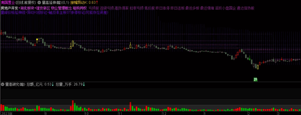 ↖2024年4月,南国置业主图示意(量峰前高V5.1,参数LINES=0,隐藏均线)