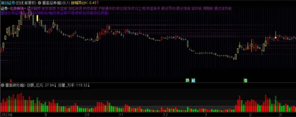 ↖2024年4月,首创证券主图示意(量峰前高V5.1,参数LINES=0,隐藏均线)