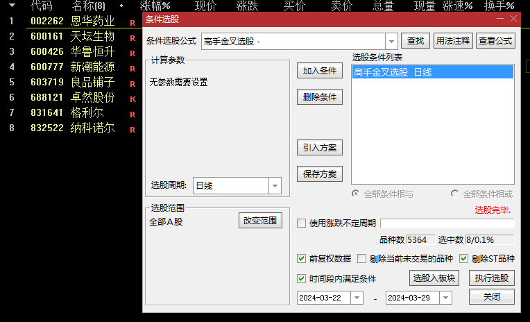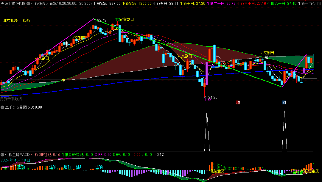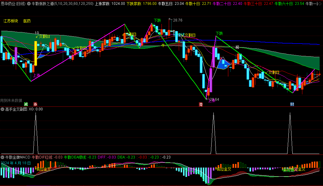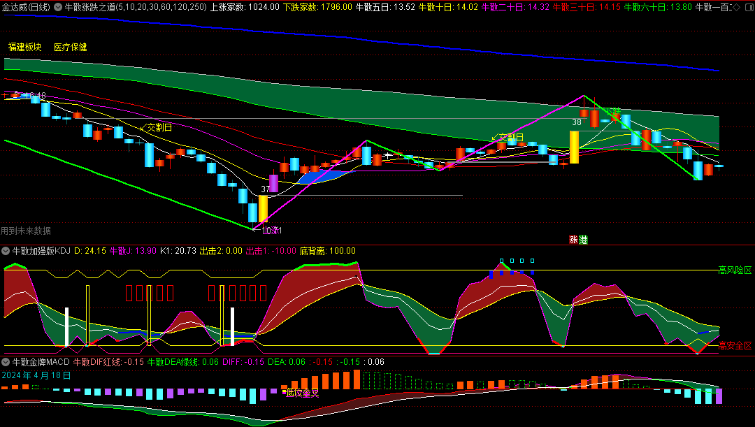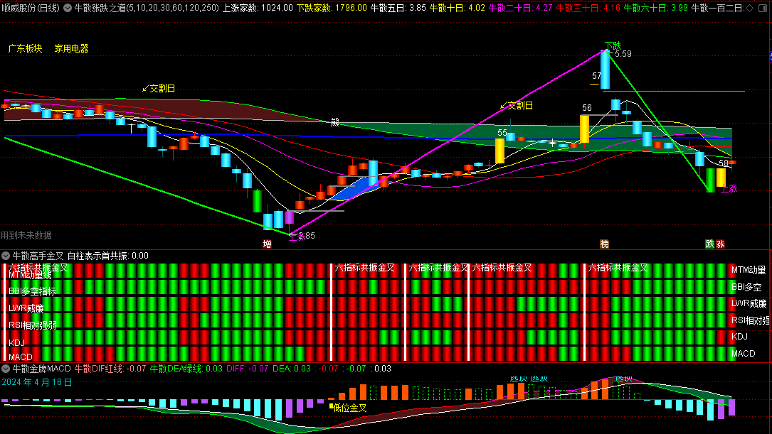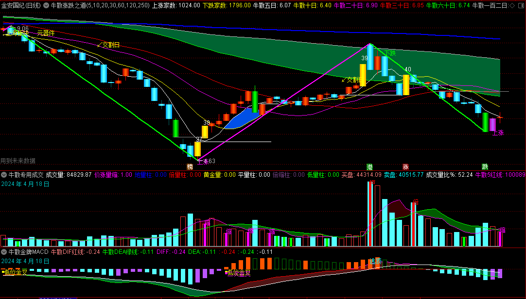 在股市的海洋中,寻找有效的分析工具如同寻找指南针。通达信牛散高手金叉股道指标套装,正是由民间高手精心打造的一套自用组合指标,旨在帮助投资者更准确地把握市场动态,捕捉投资机会。整套指标包含了牛散涨跌之道主图指标、牛散加强版KDJ副图指标、牛散金牌MACD副图指标、牛散专用成交量副图指标、牛散高手金叉副图指标及选股公式。总共六个指标,一个主图、四个副图,一个选股。