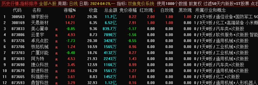 双鱼竞价系统排序指标排序的结果中,如果是主板的票,竞价涨幅都是低于6个点的,如果是创业板,竞价涨幅不会超过9个点,开盘太高的直接放弃,防止冲高回落吃大面的风险;