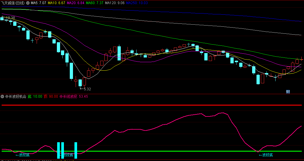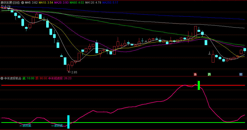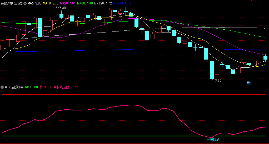 观察指标:在通达信软件中加载中长波段机会副图指标,并观察其与股票价格的对应关系。