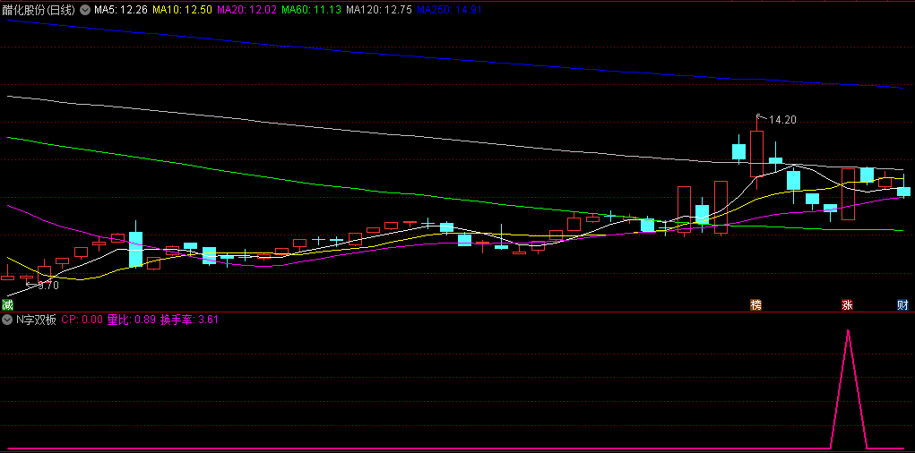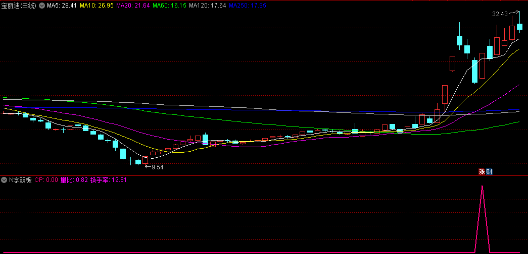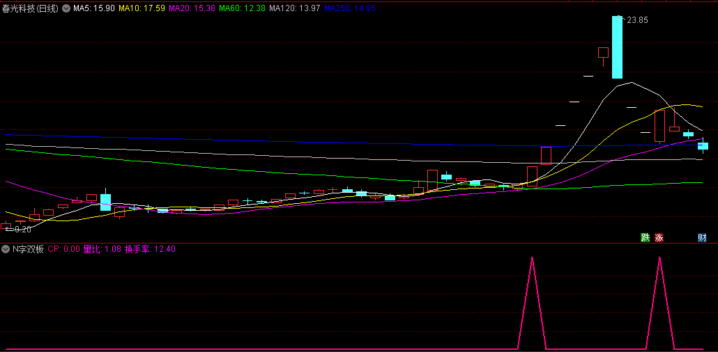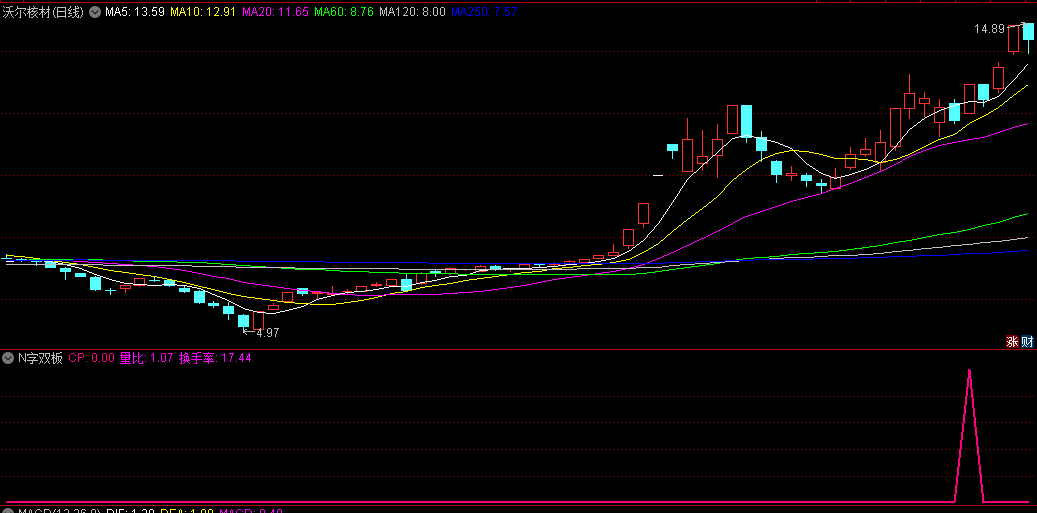 指标特点:10天内有涨停板,板后冲高回落3-10天内再次涨停就是出手时机,时机就是常说的N字形走势,把握的核心就在这震荡调整的10天内