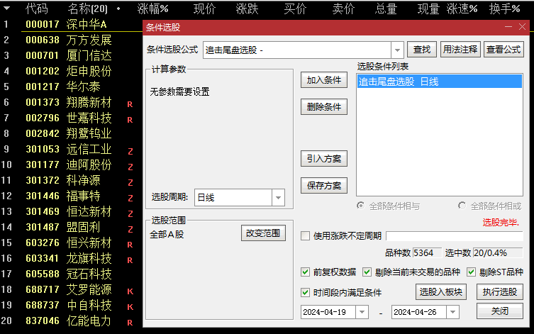 4、若在当日交易尾盘时段,所筛选出的股票数量过多,例如超过10只股票,我们建议慎重考虑是否参与。这可能是因为市场波动性增加或信号过于分散,导致选股结果的可靠性降低,因此,当面临大量选股结果时,为了风险控制和资金安全,保守的做法是避免参与,或者仅选择其中最为符合投资策略和风险承受能力的少数几只股票进行操作。