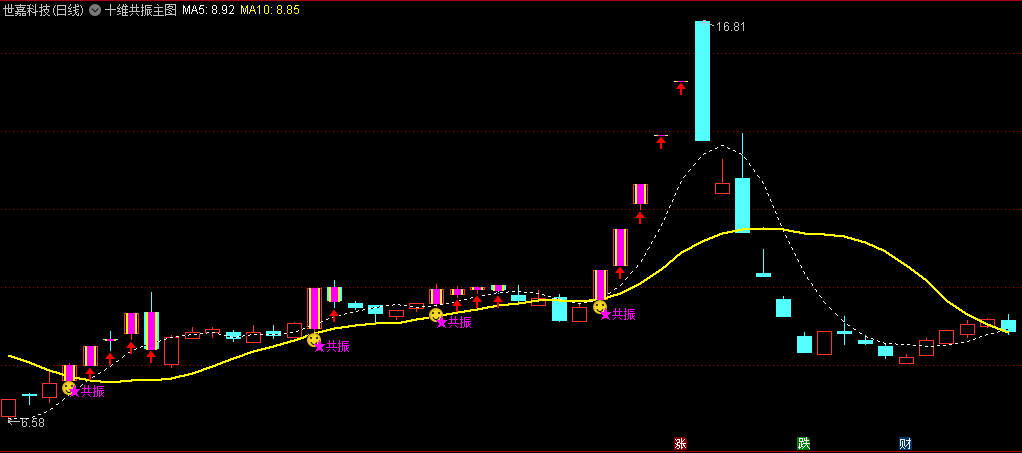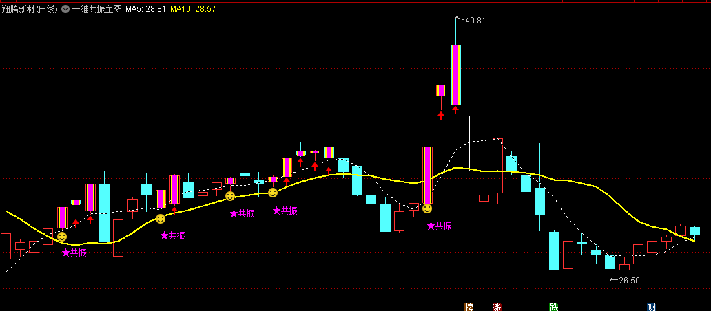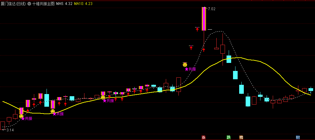 ”十维共振“是在”十全十美“指标中优化而来,(添加了些条件做了优化)已主图的形式展示出来,原”十全十美“指标是在涨停时出”钱袋子“信号;且信号少,很多时候均没有选择性;而真正的共振时并没有信号提示;非常的不方便。进一步在此优化更新!