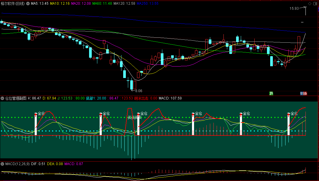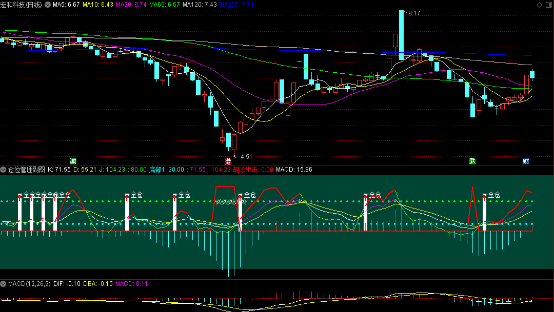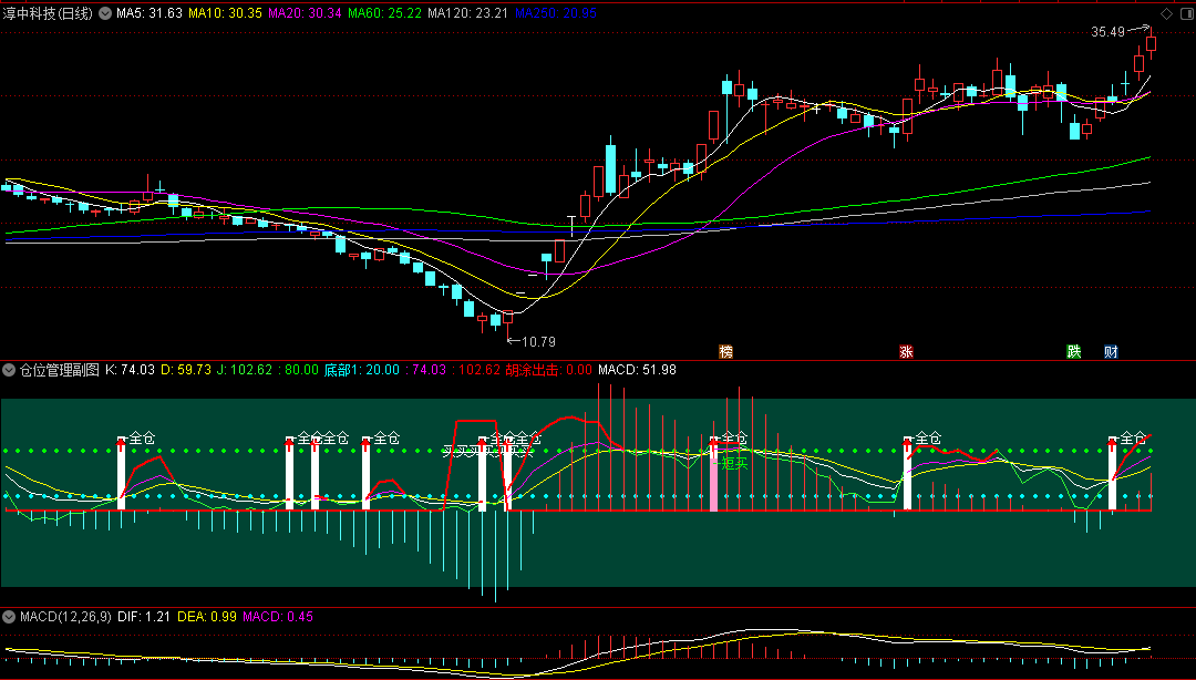 当主图“终极反转”指标显示“买进”信号,且副图“仓位管理”指标绿线上穿黄线在0轴上方出现进场。 主副图指标共振底部出现,此为初次试错买入机会。而到股价初次试错交易出现的次日,副图“仓位管理”指标显示“加仓”,且股价再度大阳线走势,预示股价即将出现连板行情,此为最后的加仓机会。