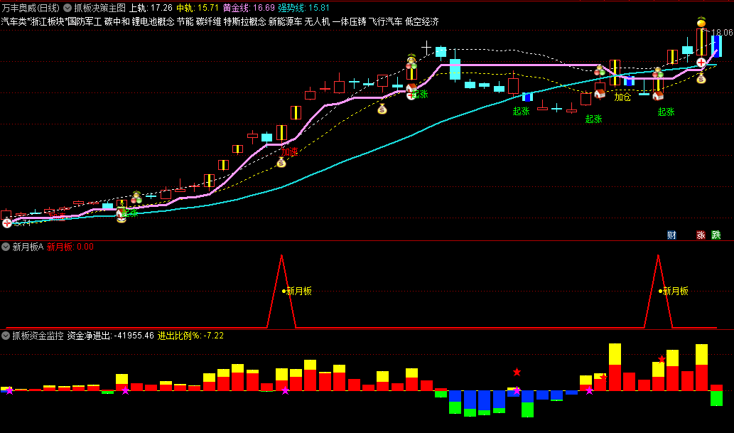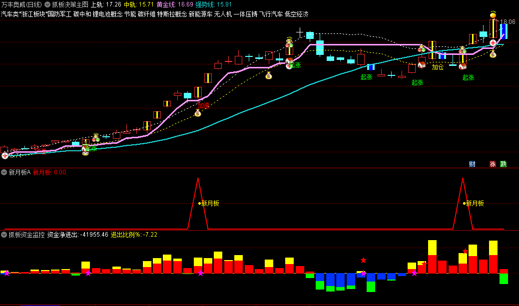 抓板决策主图指标,主图指标中有个股强势特征和突破平台等显示,出信号后结合抓板决策主图指标信号做辅助判断,使抓板如虎添翼。