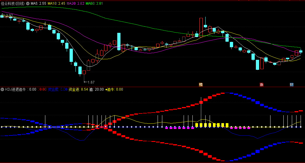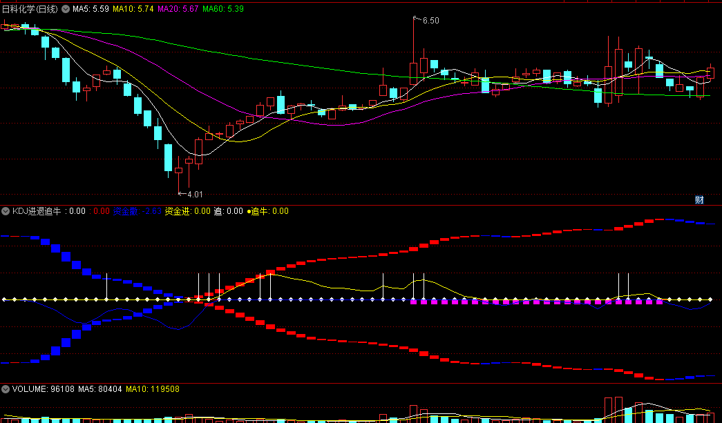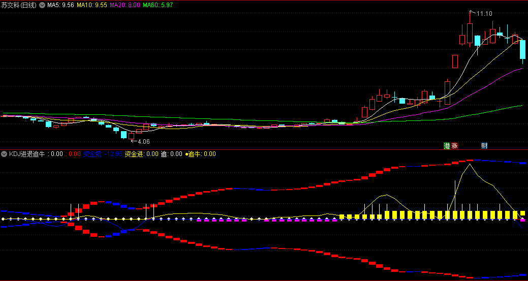 通达信KDJ进退追牛副图指标是一种技术分析工具,它结合了KDJ指标的特性和特定的交易策略,用于在资金进和资金撤之间寻找入场机会。