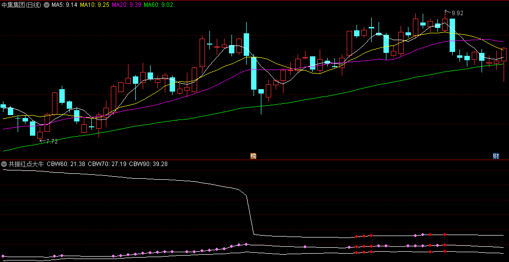 通达信共振红点大牛副图指标是一个基于筹码原理编写的技术指标,它能够在多个周期出现共振,并显示出反弹特征时,在趋势线上以红点作为标记。