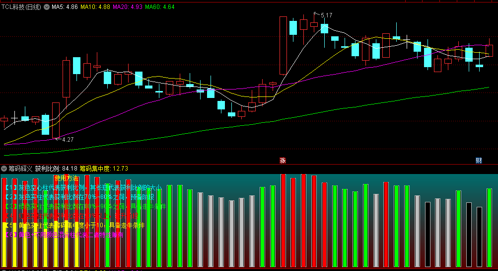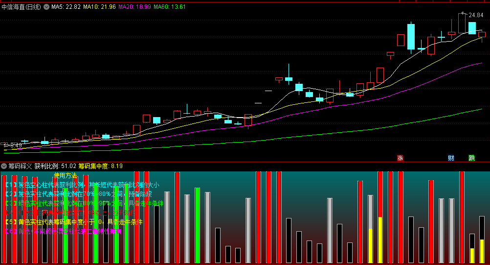 【5】黄色实柱代表筹码集中度小于10,具备走牛条件;