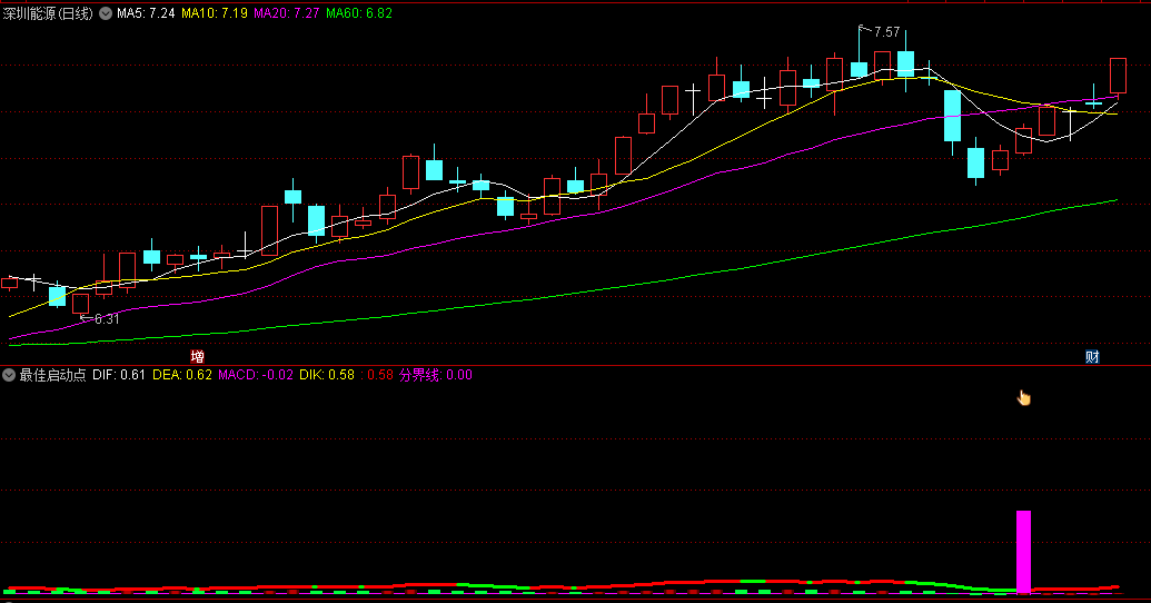 观察紫色柱子:在副图中,当MACD柱显示为紫色时,即为最佳启动点。此时,投资者可以考虑入场。