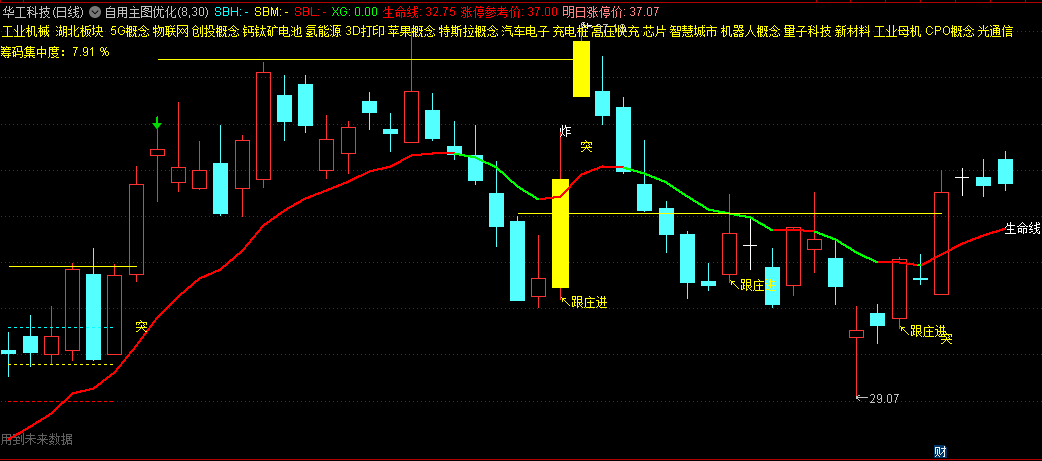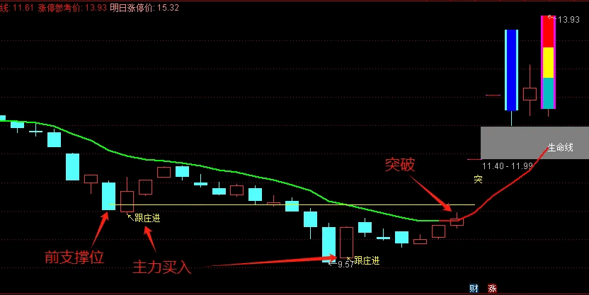 2、当主力资金大量买入时,会出现“跟庄进”的提示,根据此提示可以进行关注,这个时候主力可能是吸筹尾声,存在一定的无效信号(多数是在生命线为绿色阶段,要规避;或是在绿色阶段出现提示的当日是阳包阴,则可以买入),生命线红色阶段的时候出现“跟庄进”的提示,多数第二天是会上涨的,可以作为尾盘战法使用;