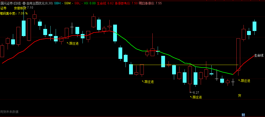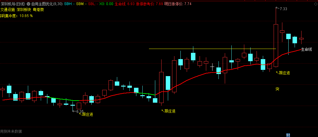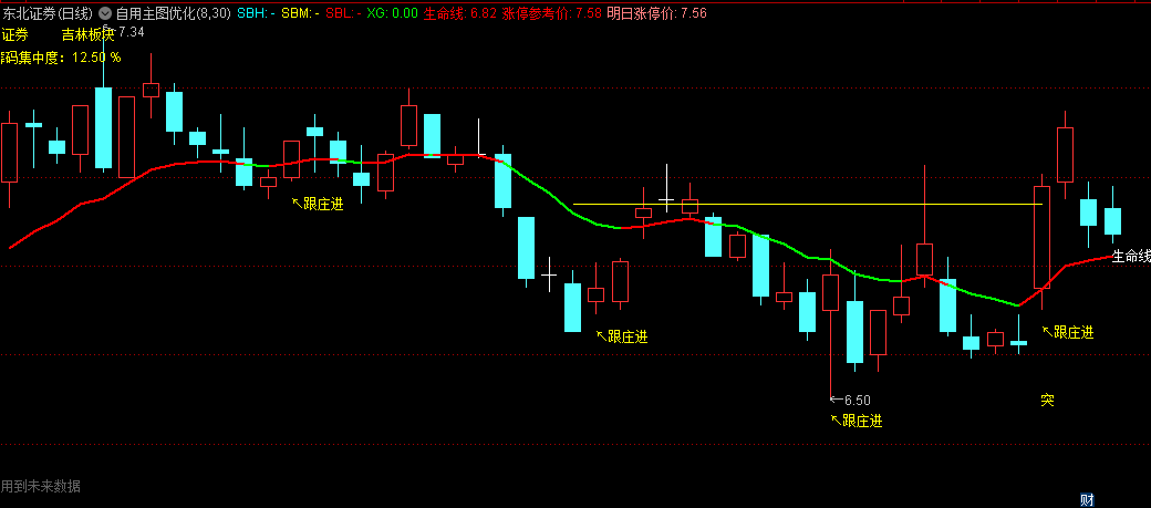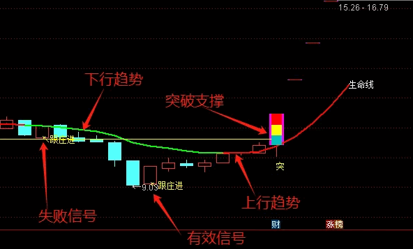 3、当生命线为红色,且前面出现“跟庄进”的提示,都是低位,可以做上行趋势;
