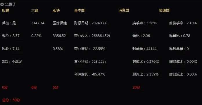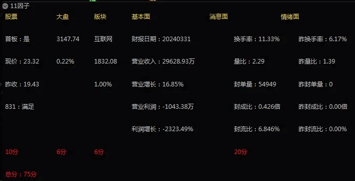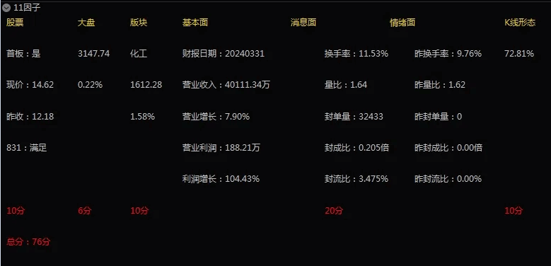 某财经老师专为学员开发,内部使用,从十一个纬度分板首板,从大盘,行业,基本面,消息面,情绪面,K线形态,MACD,KDJ,主力控盘,封单量,封成比。