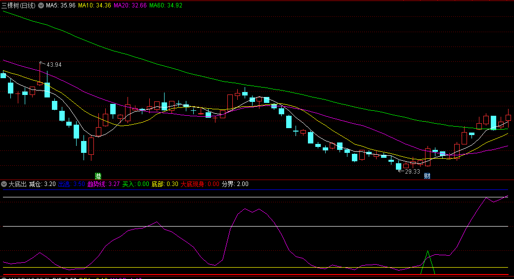 看我标注的,大底信号出现,加入自选,然后看收盘价是否止住,止住就可以进场,多看看历史。