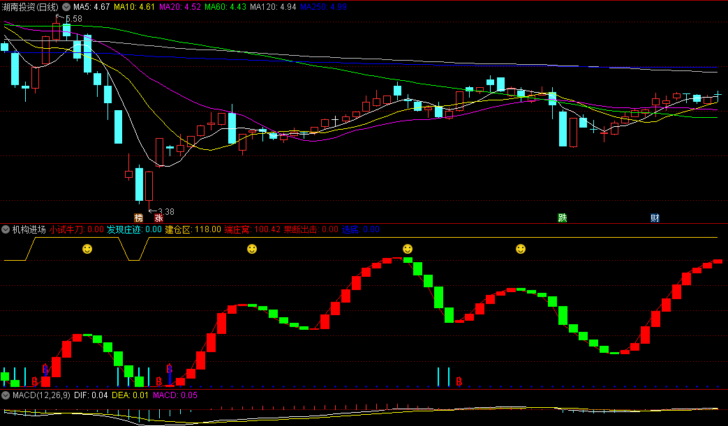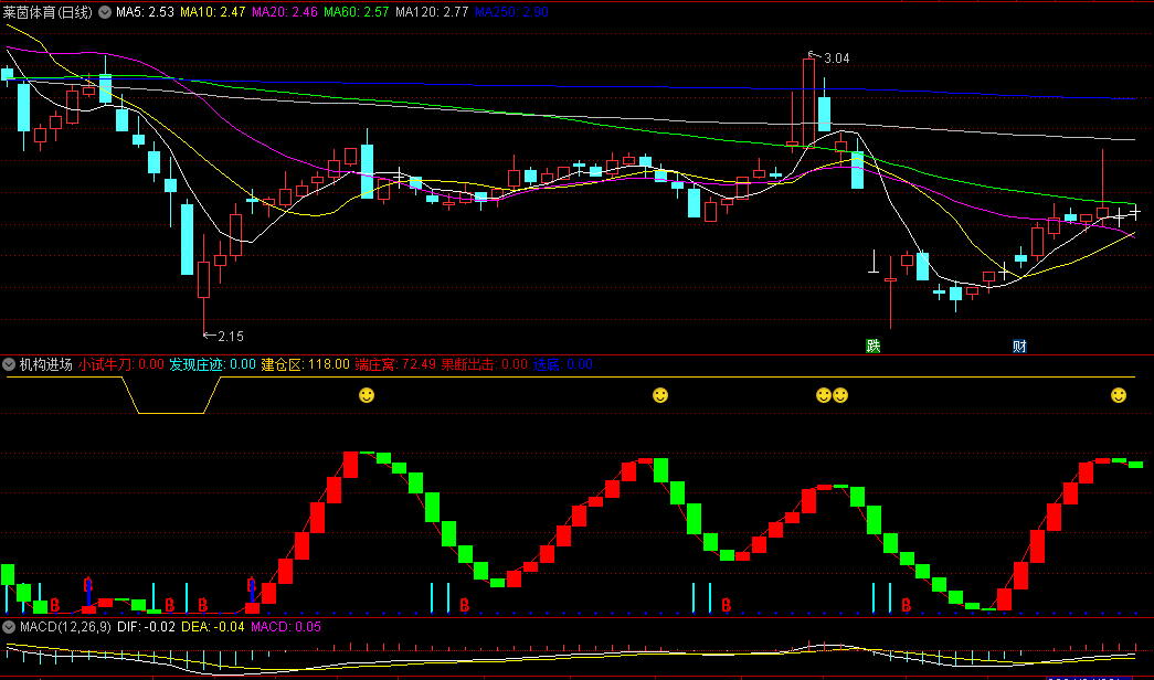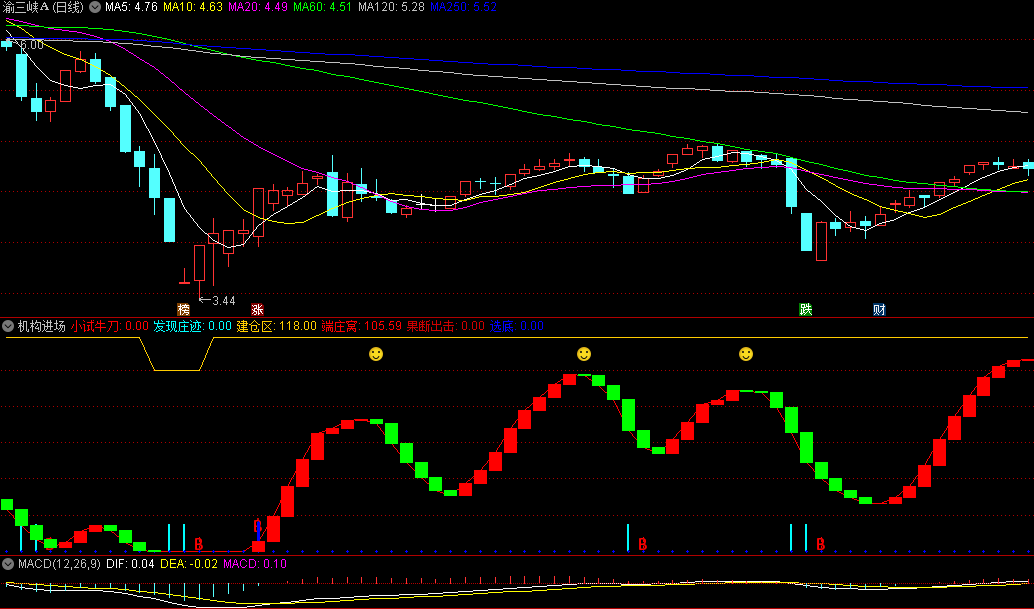 同花顺副图指标,结合K线使用效果最好。核心买卖点是看背离。当股价下跌,但机构进场指标出现了明显的拒绝下跌走势,说明行情反转一触即发,此时需要重点关注。首次买点是K线和主力进场指标完全背离出现,即K线开始收阳线,主力进场指标虽然是绿线,但较前一个交易日变小且在前一个交易日低点之上。最后加仓点是K线和机构进场指标首次共振出现,即机构进场指标收阳线,K线收阳线。