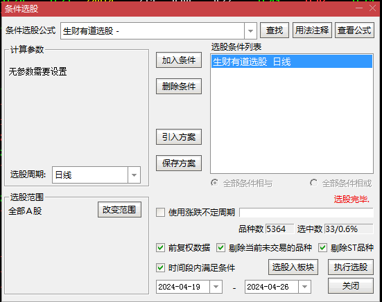 选股应用:除了作为副图指标使用外,“生财有道”指标还可以作为选股条件进行筛选。