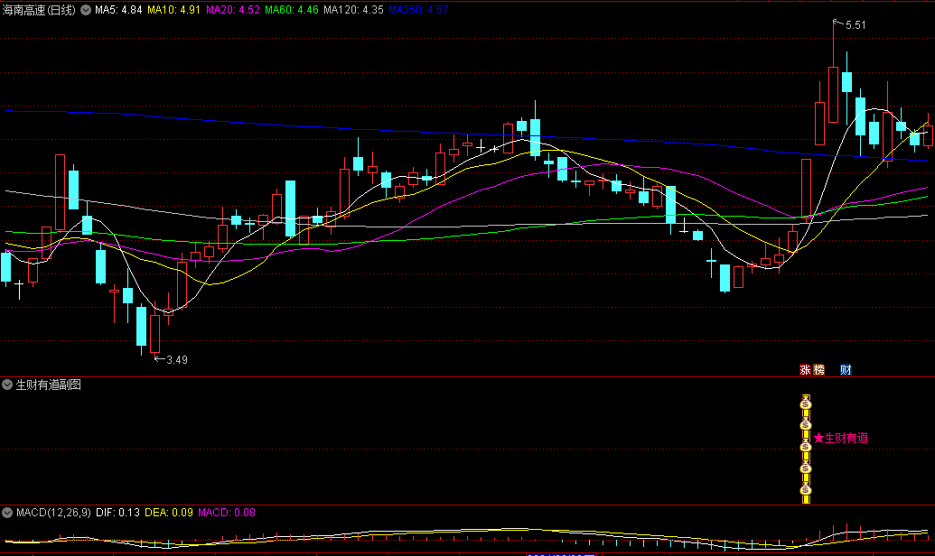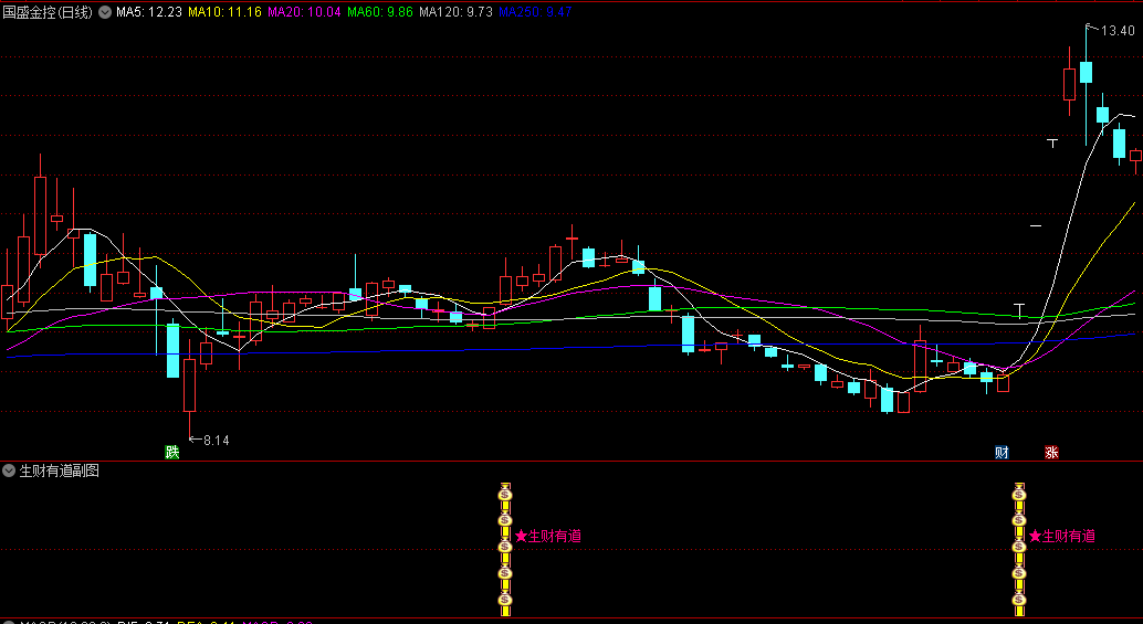 副图应用:在通达信软件的副图窗口中加载“生财有道”指标后,用户可以通过观察指标线或信号点的变化,来捕捉买入机会。