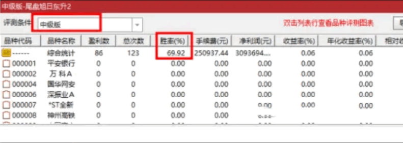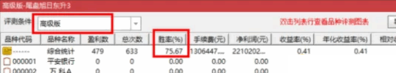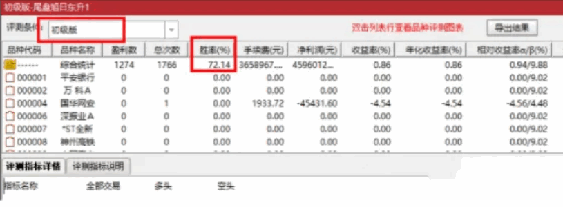 三选股指标包括御龙旭日东升初级中级高级三个选股,选股数量经过优化,信号适中。统计近一年数据,通过程序交易评测统计T+1模式次日盘中最高价止盈思路,三个尾盘选股胜率都是在70%左右,测试仓位是全仓。