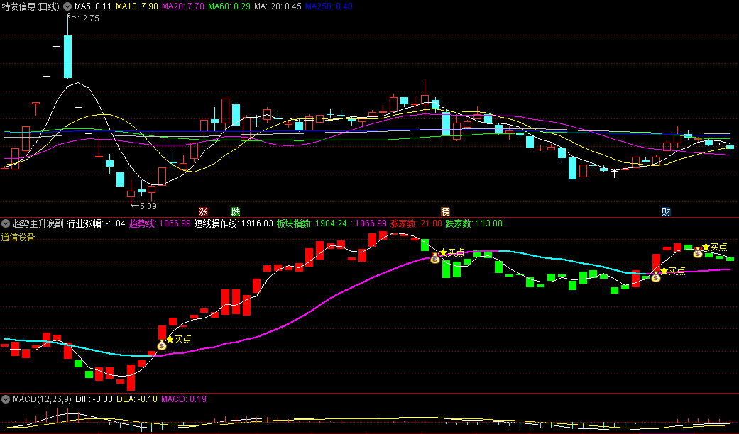 观察趋势线:首先,投资者需要观察股票的趋势线。当趋势线由绿色变为红色时,代表股票处于上升趋势;当趋势线由红色变为绿色时,则代表股票处于下跌趋势。投资者应重点关注上升趋势中的股票。