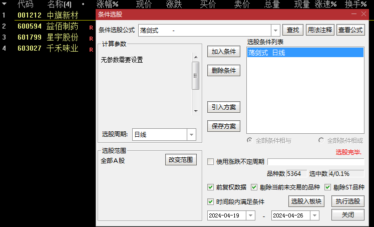 选股指标:选股指标可以自动筛选出符合荡剑式买入条件的股票。投资者可以将这些股票加入自选股,以便进行后续的跟踪和分析。