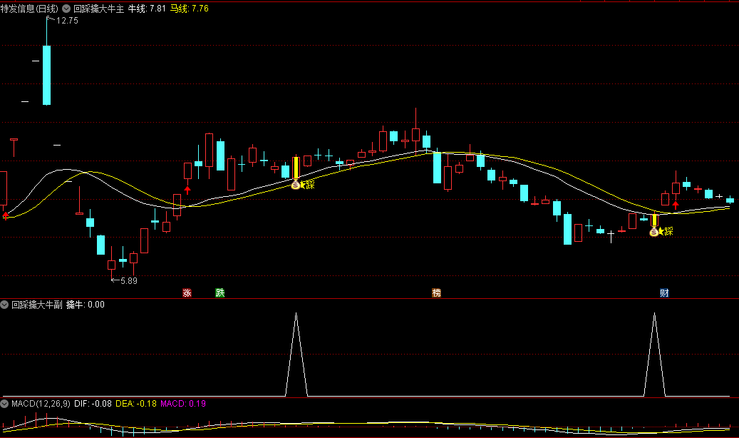 主图中的两条线被称为“牛马线”。当这两条线形成金叉(即短期线上穿长期线)时,系统会在图上标出一个“红箭头”作为买入的信号。这是一个强烈的买入提示,表明市场可能即将进入上涨趋势。