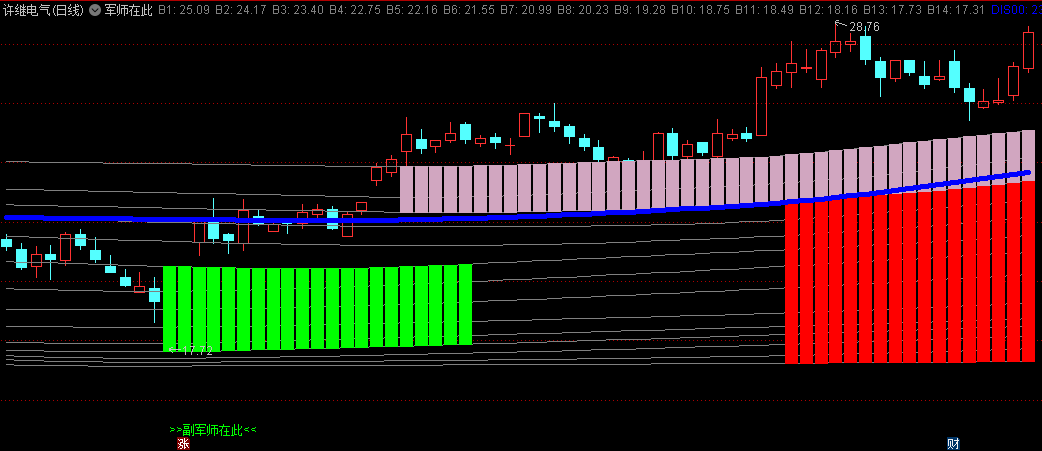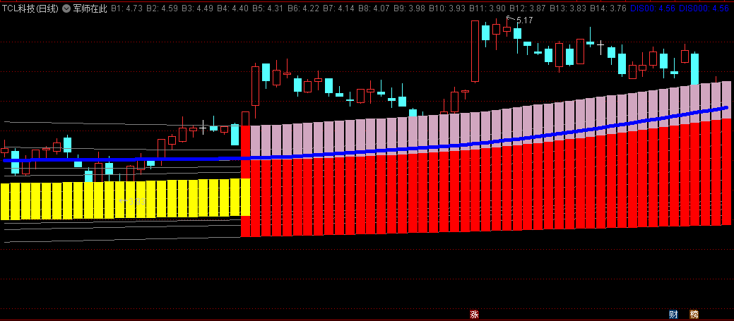 通达信军师在此主图指标是对趋势方向把握有一定帮助的指标,使用了COST函数,并结合K线周围的背景颜色来直观地展示股票的走势状态。
