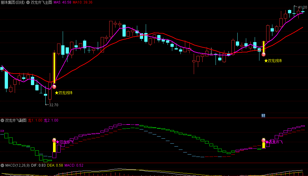 当指标在底部区域同时出现红色和洋红色线段时,这两个颜色的线段将会形成波段共振,这种共振形态犹如两条向上的“飞龙”同时起飞,因此被称为“双龙起飞”。这种共振现象通常预示着市场即将迎来一波上涨行情,是投资者买入的良机。