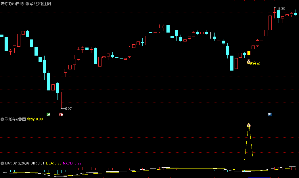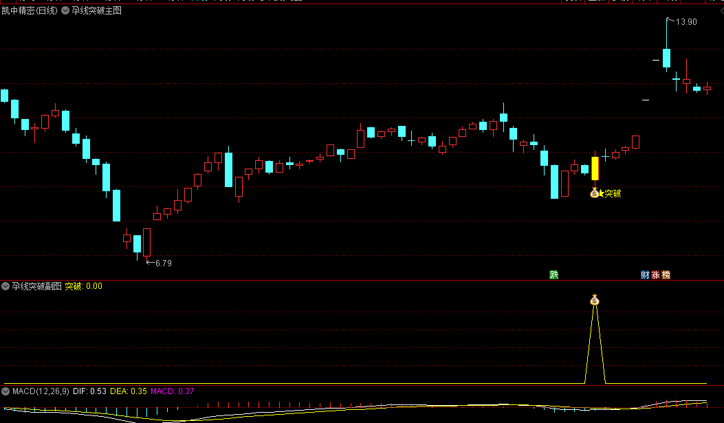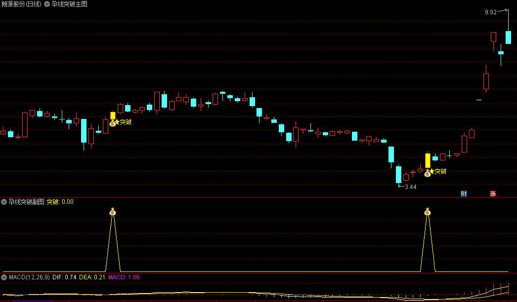 指标包含1主图1副图1选股,孕线突破主要关注的是孕阳线的形态,从图中可以看出识别特定的孕阳线K线组合后,形态突破阻力位,后市买盘力度增强,进而进一步上涨。整体来看该指标选股数量适中,成功率较高。不含未来函数!