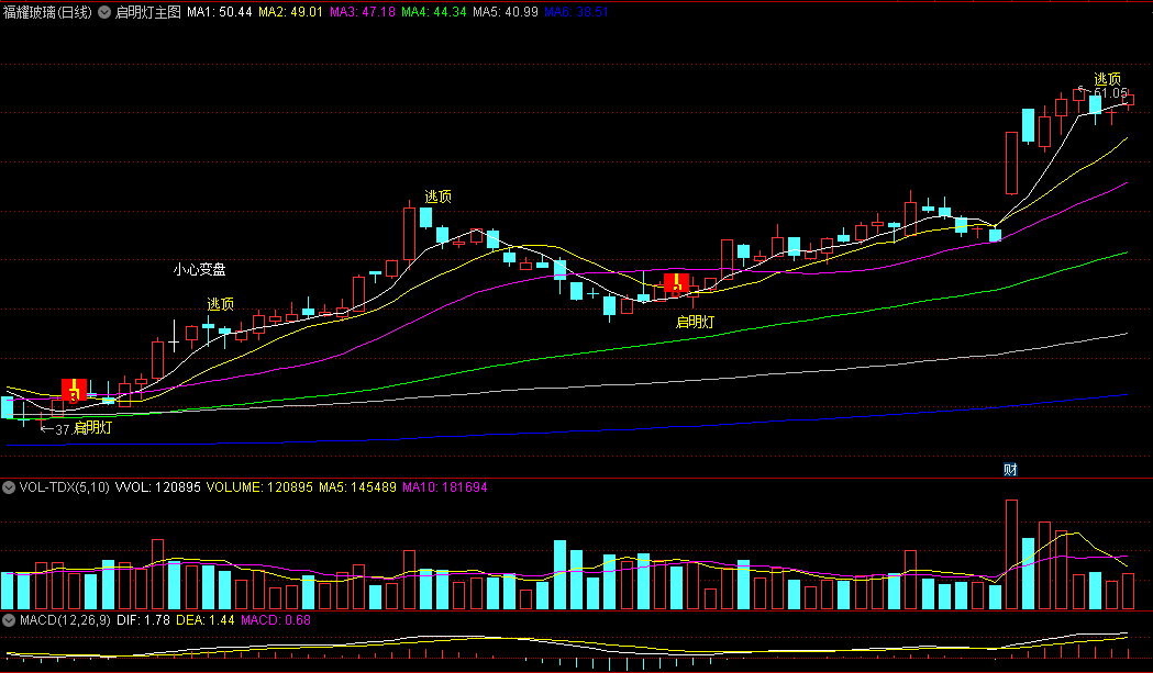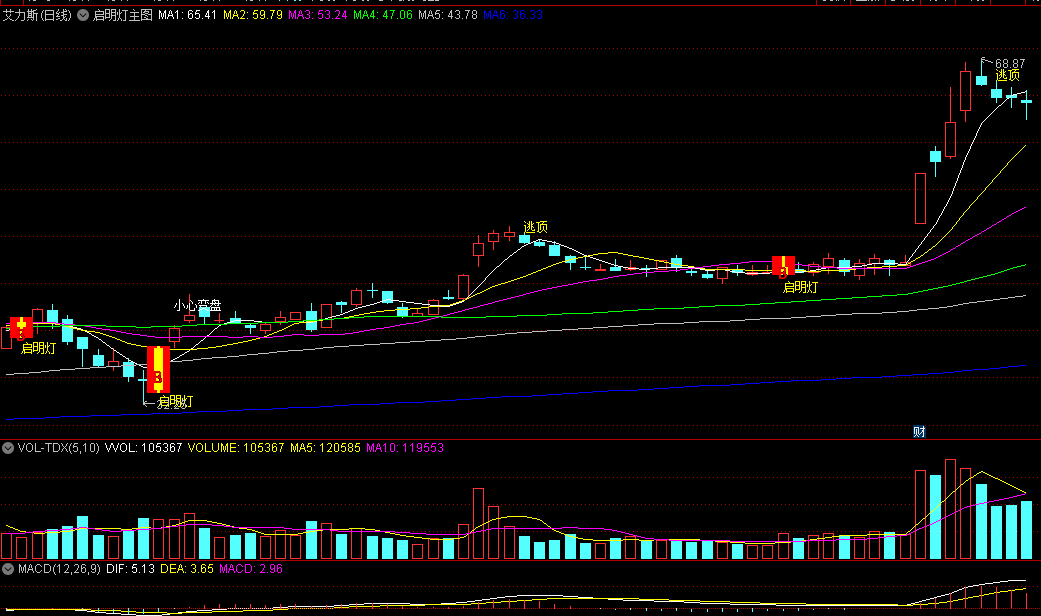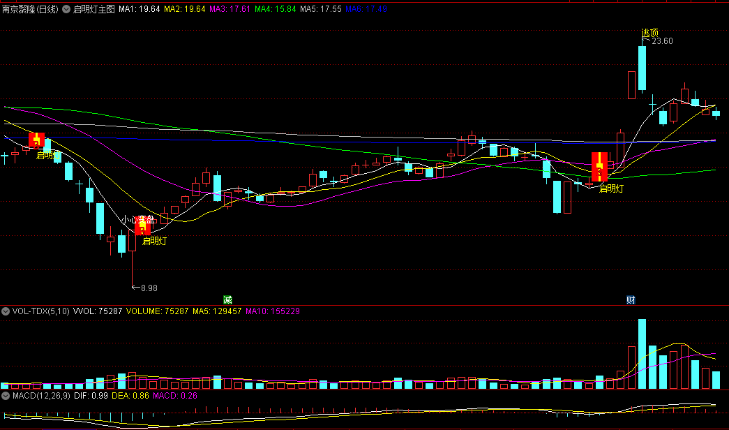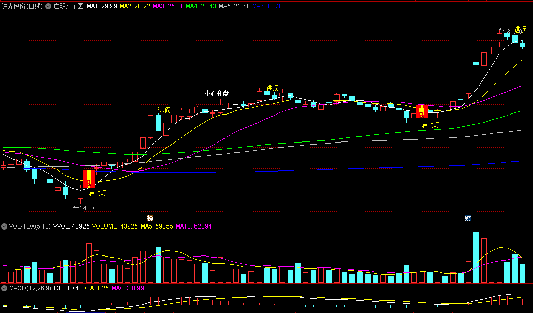 低吸入场处有“启明灯”文字提醒信号,高处遇到风险,会有“小心变盘”和“逃顶”文字提醒,非常的贴心。