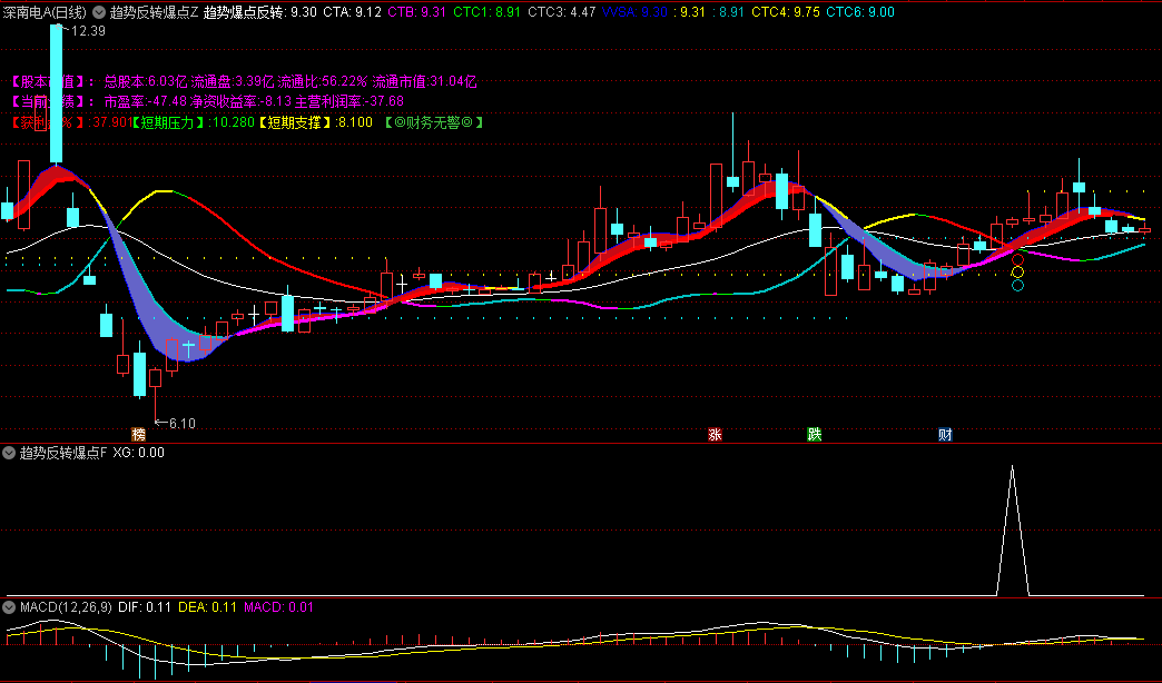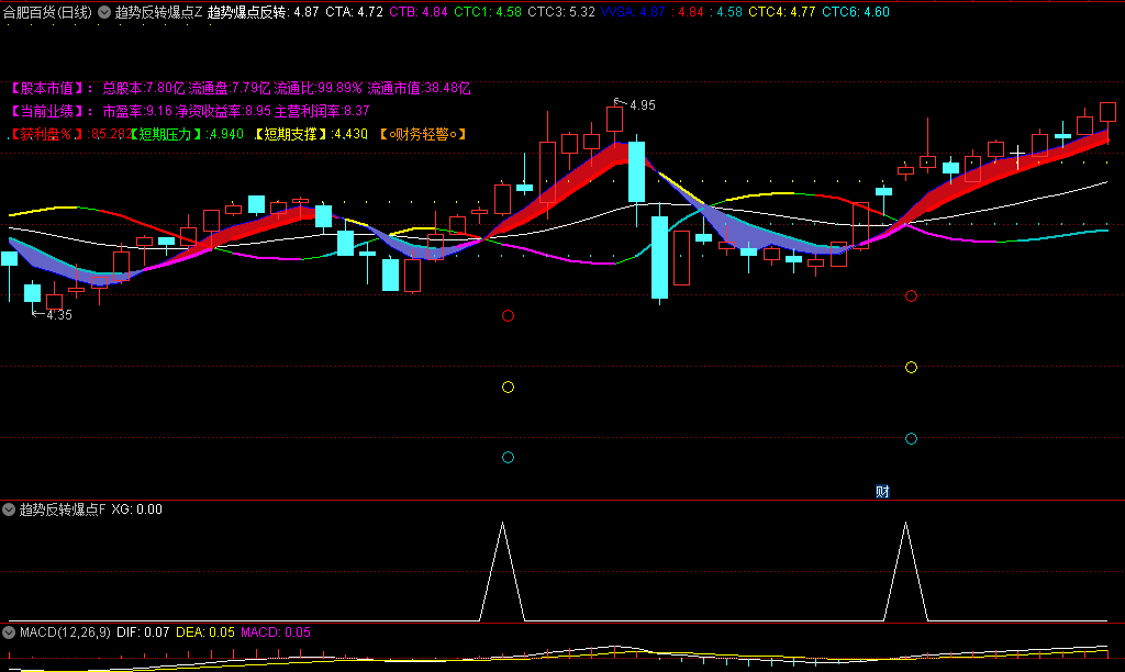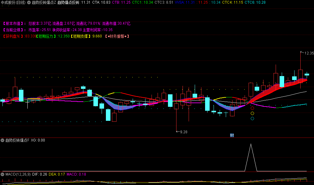 当筹码带上穿成本线,形成金叉时,并且大阳穿越,MACD零轴之上,下方出现“爆点”信号就是反转的买点。