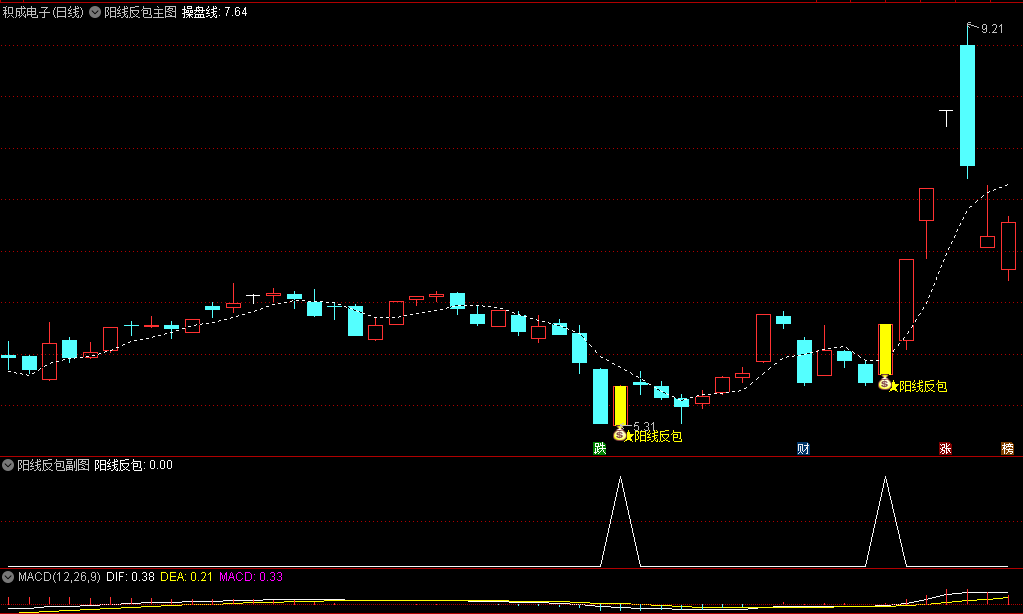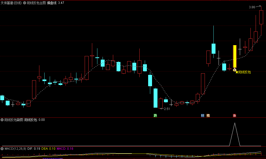 指标原理:后一条阳线强势反包前一天的阴线,发出买入信号。