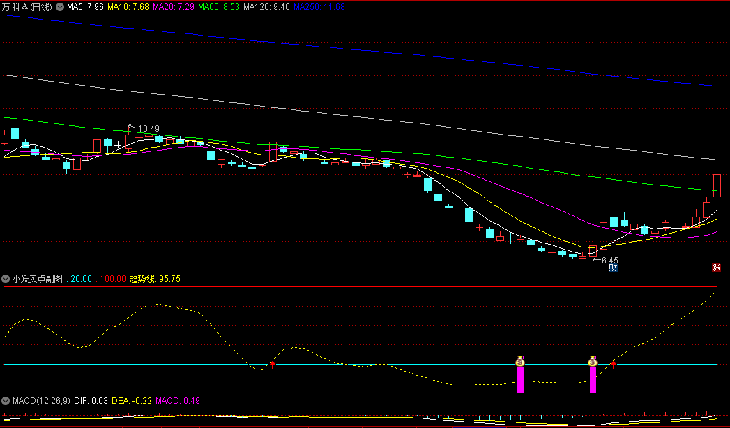 【小妖买点】是一个相对底部的买点指标,特别输出的”买点“信号,且没有未来函数,但指标逻辑有区别,所以并不是它,不要混肴了,这里特别说明!并添加了趋势线标识,从买入--加仓--减仓/卖出的整个过程。