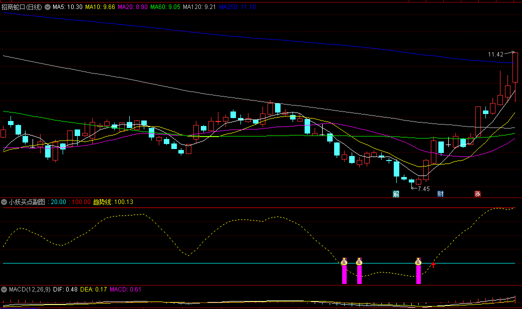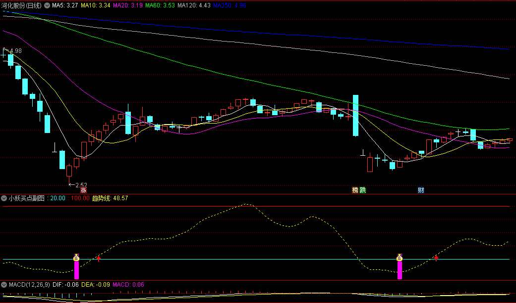 1、趋势线从底部上穿20青色线为多头行情,可考虑买入或加仓;
