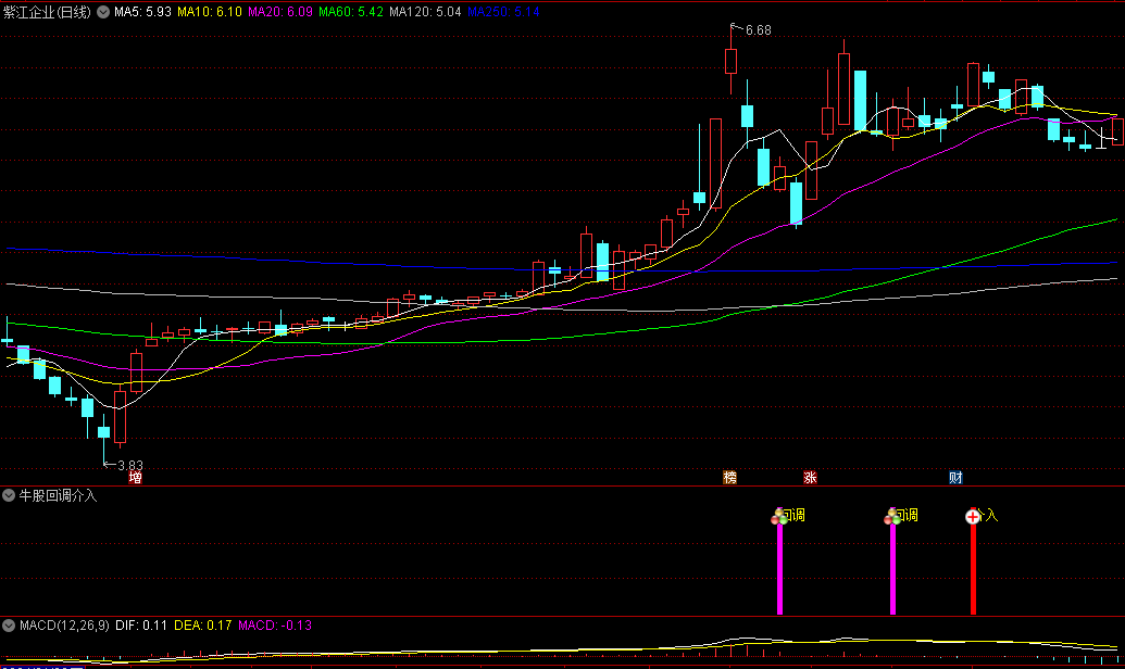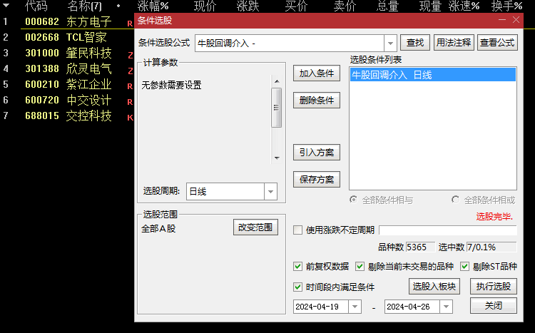 通达信牛股回调介入副图/选股指标是一款针对股票市场中牛股回调阶段设计的专业分析工具。该指标主要关注那些在牛股上涨过程中形成的价格洼地,精准预警出具备低涨幅、适中交易量、高可操作性和当天高收益潜力的个股。它是投资者寻找和把握“回头牛”行情的得力助手。