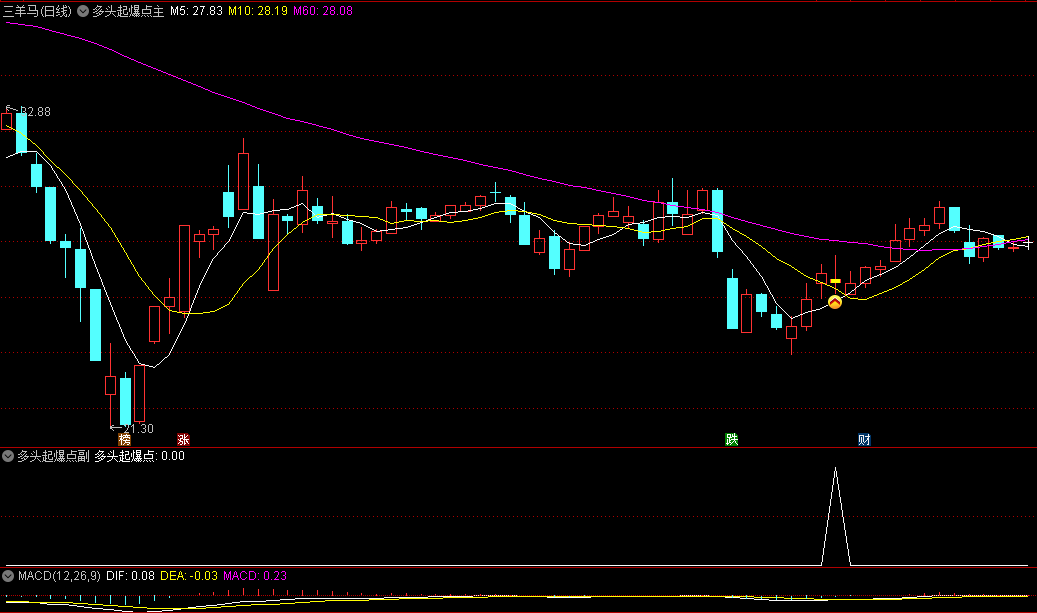 主图使用:在主图上,投资者可以观察到均线金叉和KDJ随机指标的买入信号。当这个信号同时出现时,可以认为市场处于多头起爆点附近。此时,投资者可以结合其他因素综合判断是否入场。