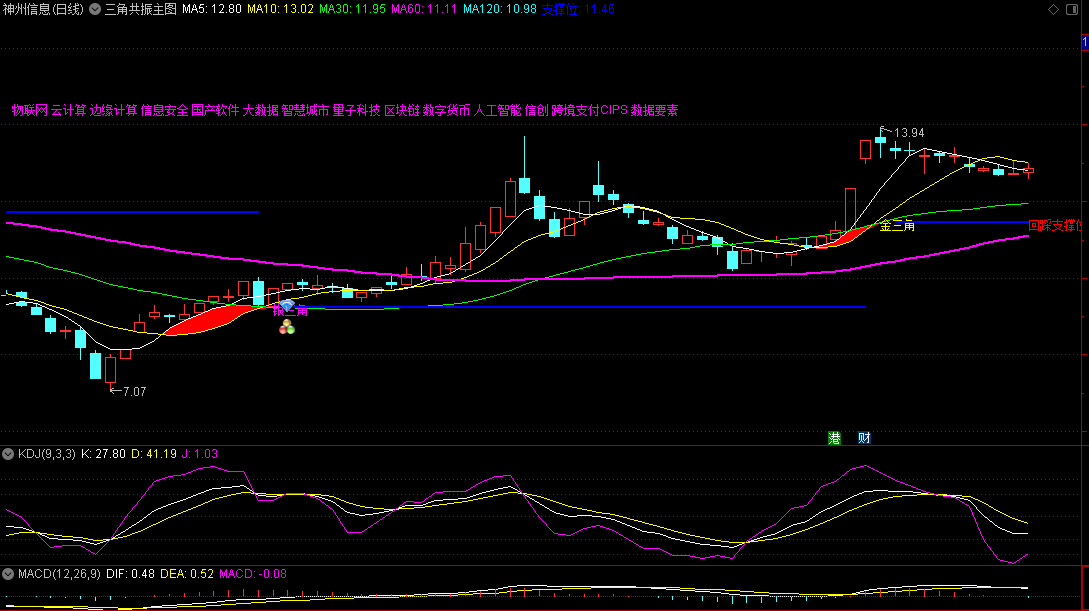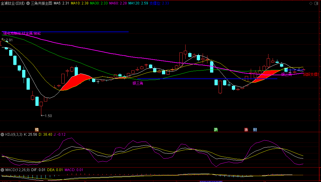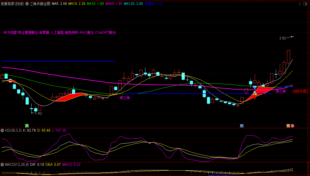 通达信三角共振主图指标是一个在技术分析上进行了优化的指标,它结合了均线系统、黄金柱、MACD、KDJ、RSI等多个指标的共振效果。