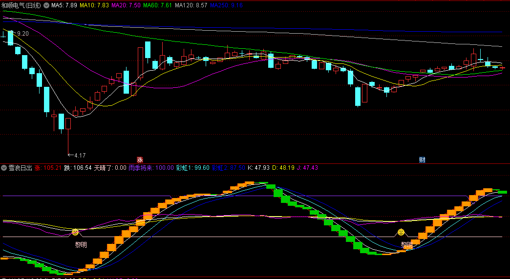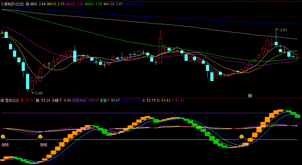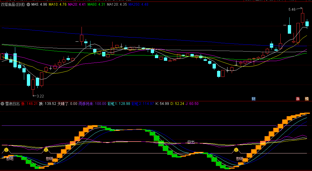 雪浪日出指标,专门捕捉阶段性底部的指标。当指标发出“日出”信号或当指标的“日出”与“黎明”信号同时出现时,就是买入时机。当然,此指标需结合其他指标及大盘趋势综合分析。股市有风险,入市需谨慎!凭此操作,风险自担!