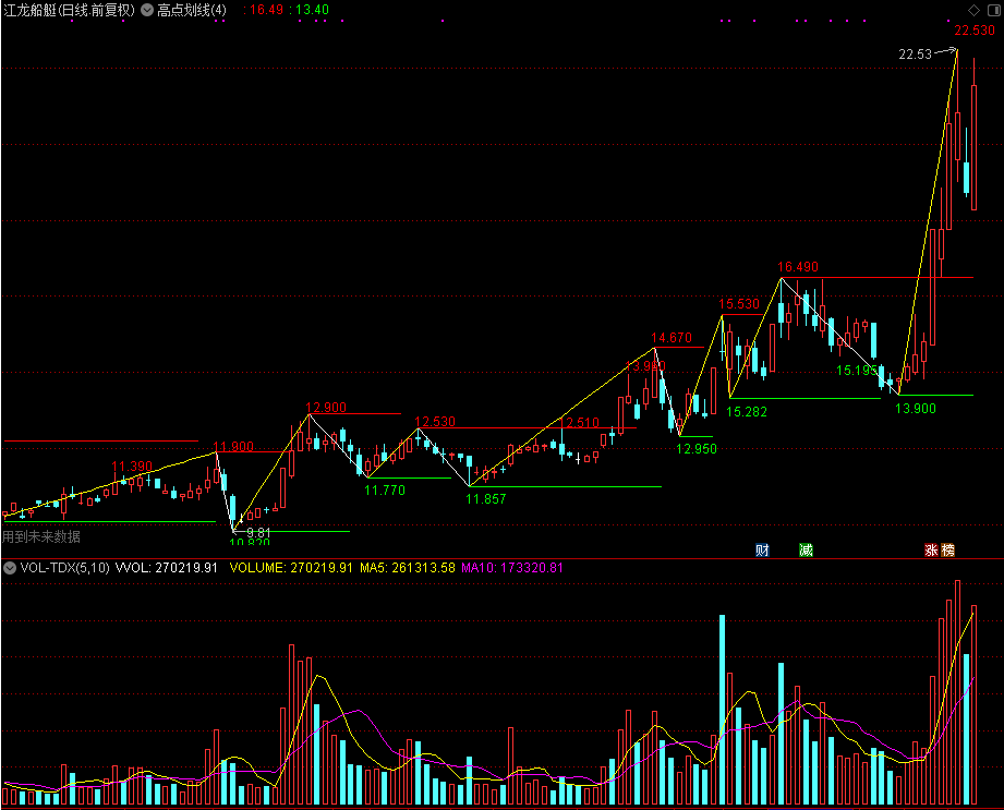 DRAWNUMBER(GAO,ZG*1.03,ZG),COLORRED;{显示高点值};