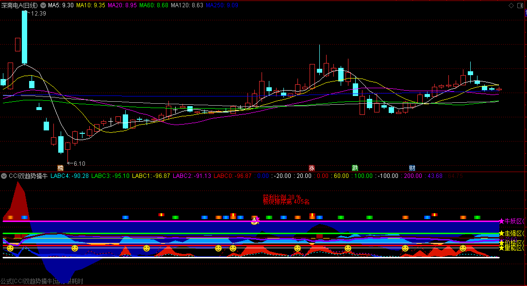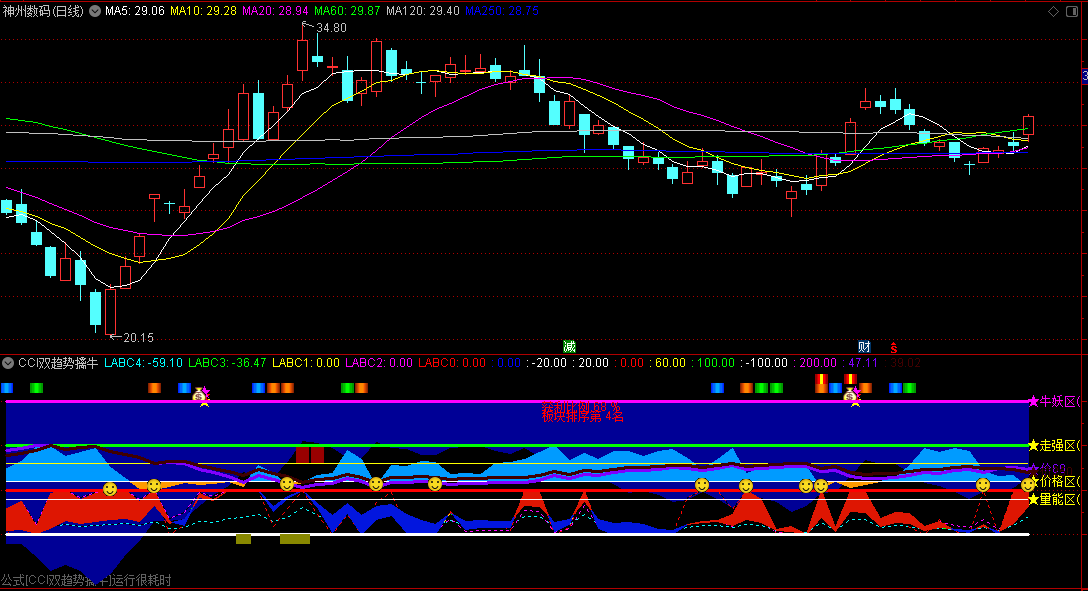 “钱袋子”信号和“笑脸”信号:这两个信号是指标中设置的特定选股条件,当满足这些条件时,指标会发出相应的信号,提示投资者关注这些潜在的强势股票。
