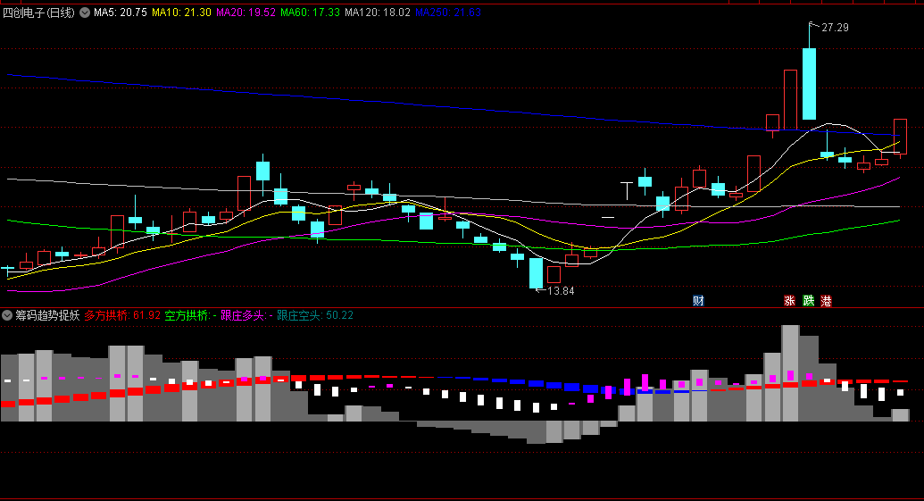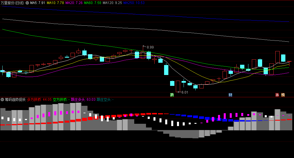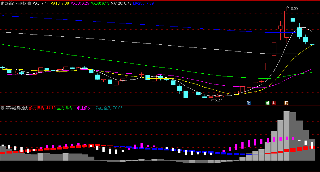 趋势线与筹码峰的结合:在通达信筹码趋势捉妖股幅图指标中,你会看到两条彩色的趋势线叠加在灰色的筹码峰之上。这两条趋势线,一条为红蓝色,另一条为白紫色,它们通过信号的互相确认来辅助投资者做出决策。