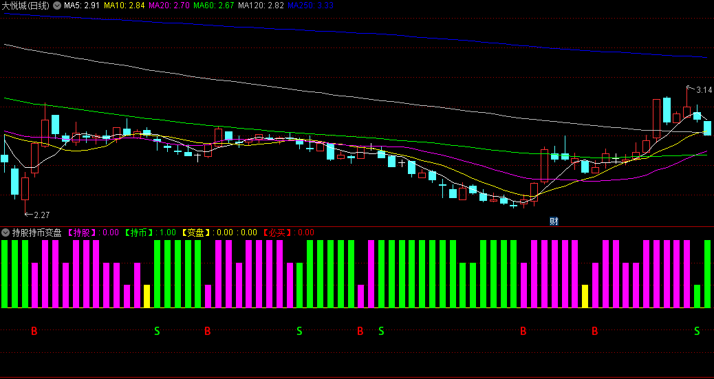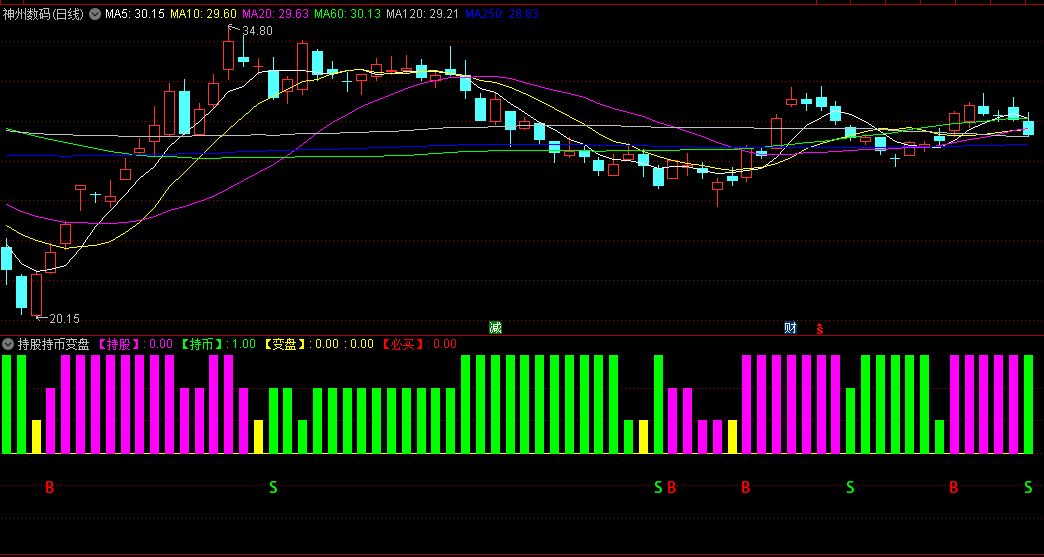 副图图指标,不含未来函数!绿色柱持币观望,紫色柱子持股,橙色柱变盘,红色柱必买;B信号表现买入,S信号卖出。