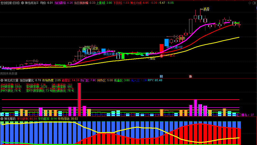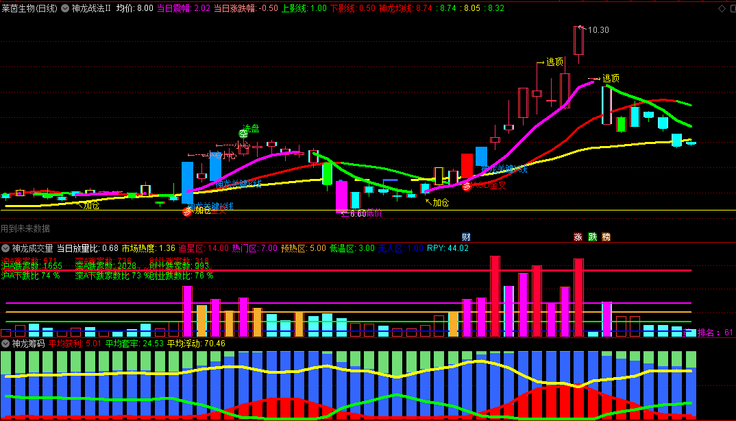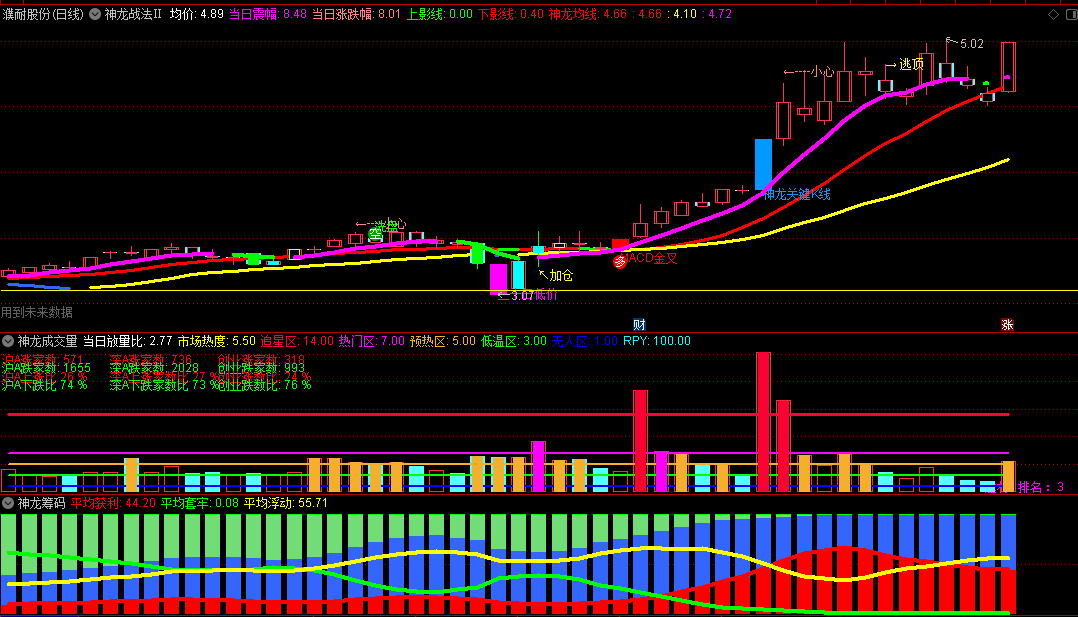 【神龙战法Ⅱ】是在【神龙战法】套装的基础上加入了“均价”、“上下影线幅度”、“逃顶”、“加仓”等要素;