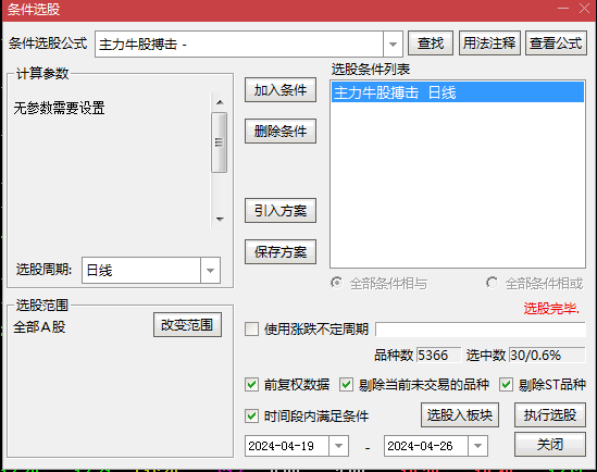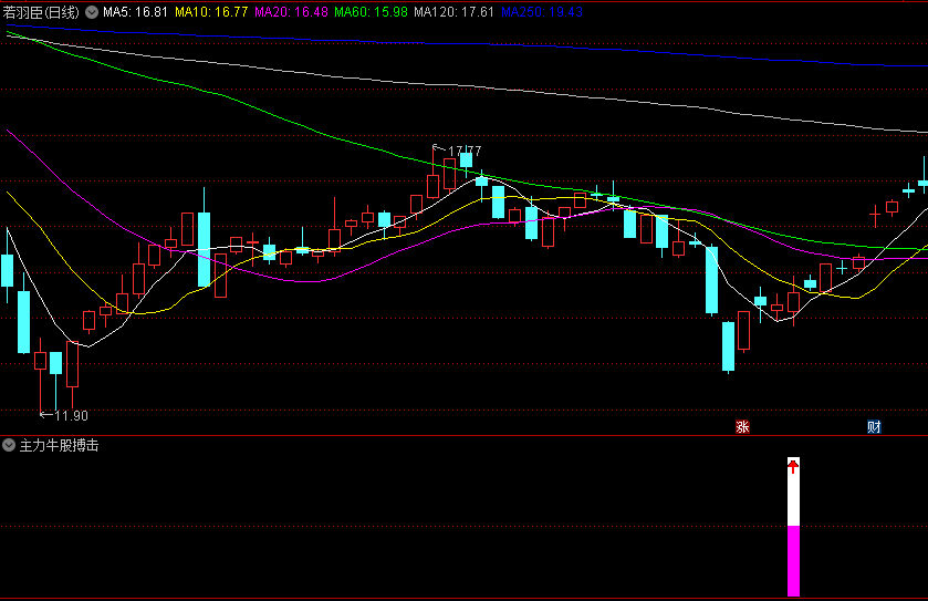 主力牛股搏击副图/选股指标是一个专门用于识别主力资金入场、底部形成并预示牛股诞生的技术分析工具。该指标通过深入的市场分析和精确的算法,旨在帮助投资者捕捉那些因主力资金大量流入而即将启动的个股,特别是在其刚刚形成底部的阶段。经过测试,该指标在近期成功捕获了多只牛股,且未发现使用未来函数的情况,保证了其稳定性和可靠性。