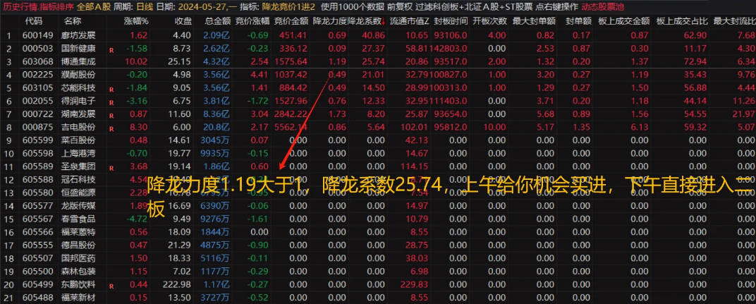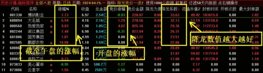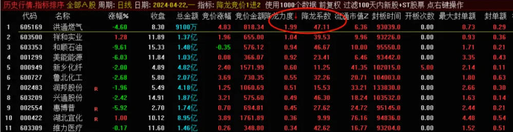 交易日9点25~9点30分,进行排序,取降龙力度和降龙系数这两个的排名,建议以降龙系数为主。