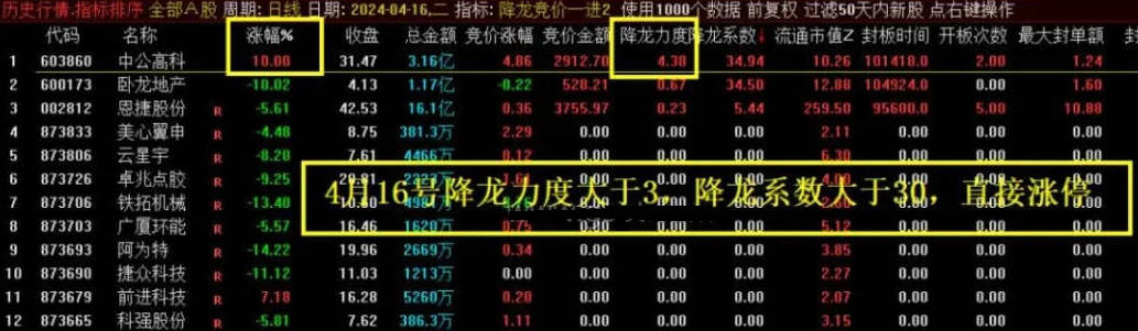 如果当天行情一般的时候,除了要参考降龙系数外,建议再关注降龙力度,最好力度大于1,降龙系数大于30是最好的搭配