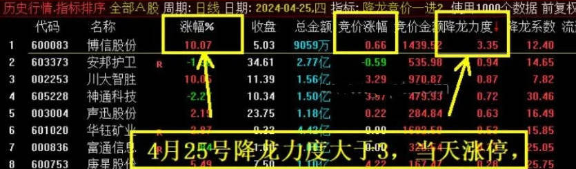 当然如果降龙力度出现大于3的情况可以直接参考不需要搭配降龙系数,比如4月25号那天竞价选出的数据