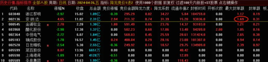 不够小,那么就看最大封单额最大的,就是安纳达,当然,没有张停,因为这一天主板一进二成功的只有一个,其他全是失败,所以能够选出安纳达也是很不错了的,当天有浮盈: