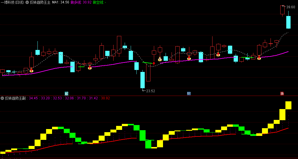 反转趋势王是一款基于道氏理论的顺势而为原则精心制作的技术指标。它能够清晰地展示出市场趋势的力量,并认为趋势一旦形成,就不会轻易反转,这是反转趋势王成立的理论基石。该指标适用于多种投资周期,无论是短线交易、中长线布局,还是波段操作,都能提供明确的买卖信号,帮助投资者在各级别市场中把握机会。